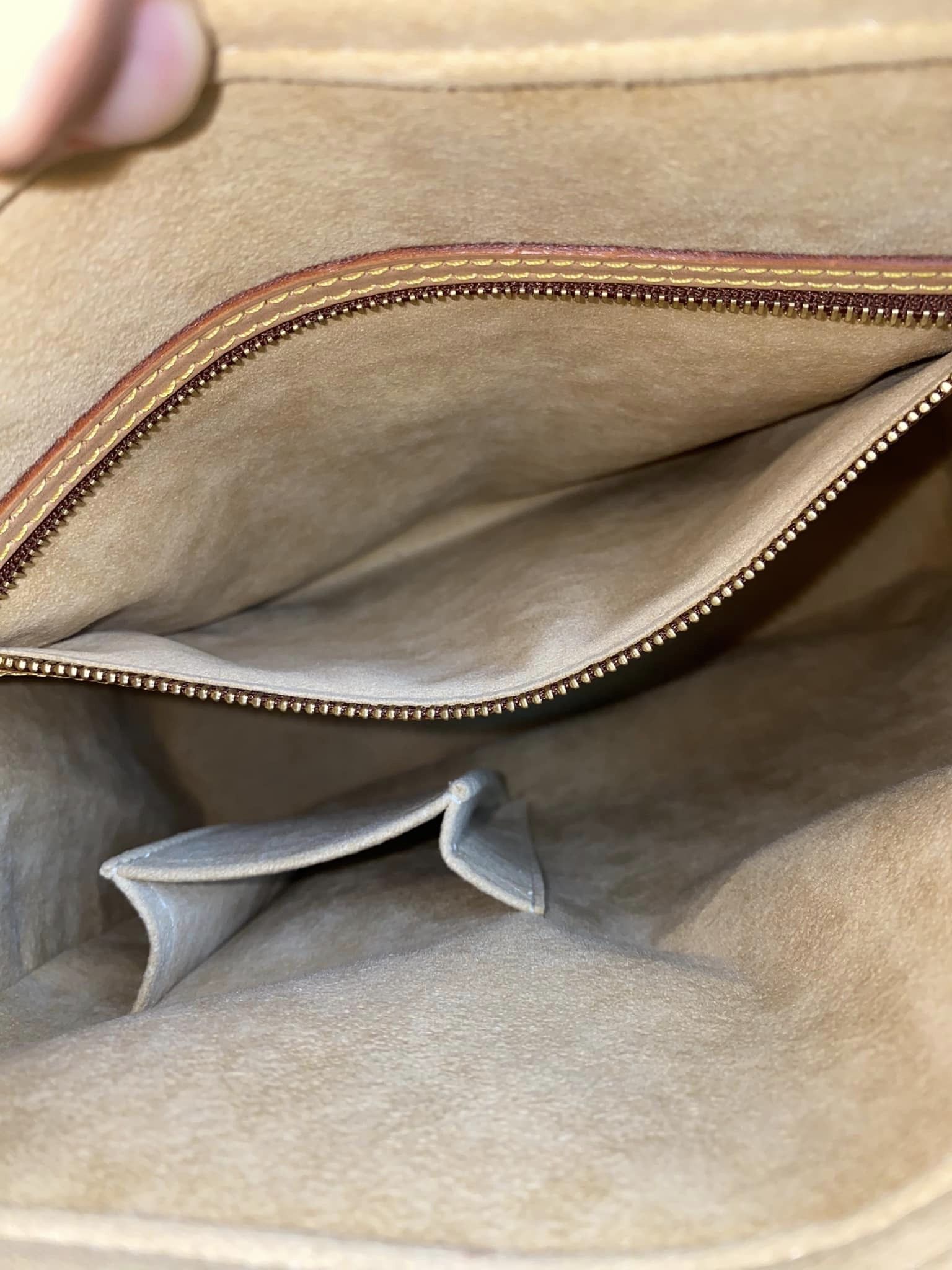 In excellent condition overall. Canvas is in excellent shape and clean, with a beautiful light honey patina handle showing very light signs of use, sturdy and no cracks. Gold-plated hardware is still shiny, with only mild scratches. Velvet interior is clean, as are the pockets.